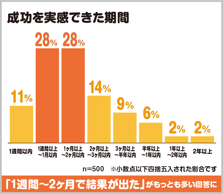 何kg痩せたいのか、いつまでに痩せたいのか、目標は人それぞれですが、どのくらいで成果が出ているのか聞いたところ、「1週間〜1ヶ月」と「1ヶ月〜2ヶ月」がほぼ同数でした。