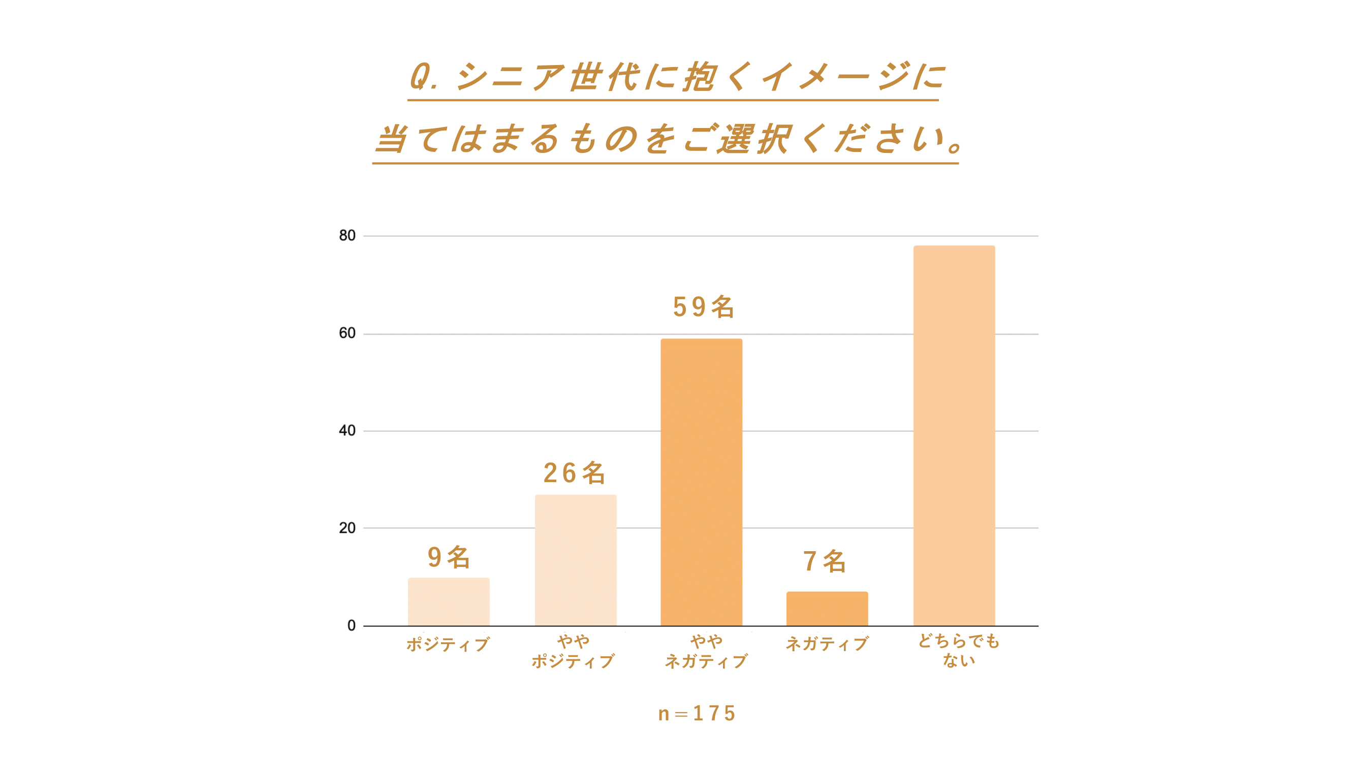 この度、現状のシニア世代(=65歳以上)に対しての20〜30代の孫世代のイメージをより深く知るべく、10代後半から30代前半までの男女の若者175名を対象に「シニア世代・高齢化社会へのイメージ調査」を実施しました。
