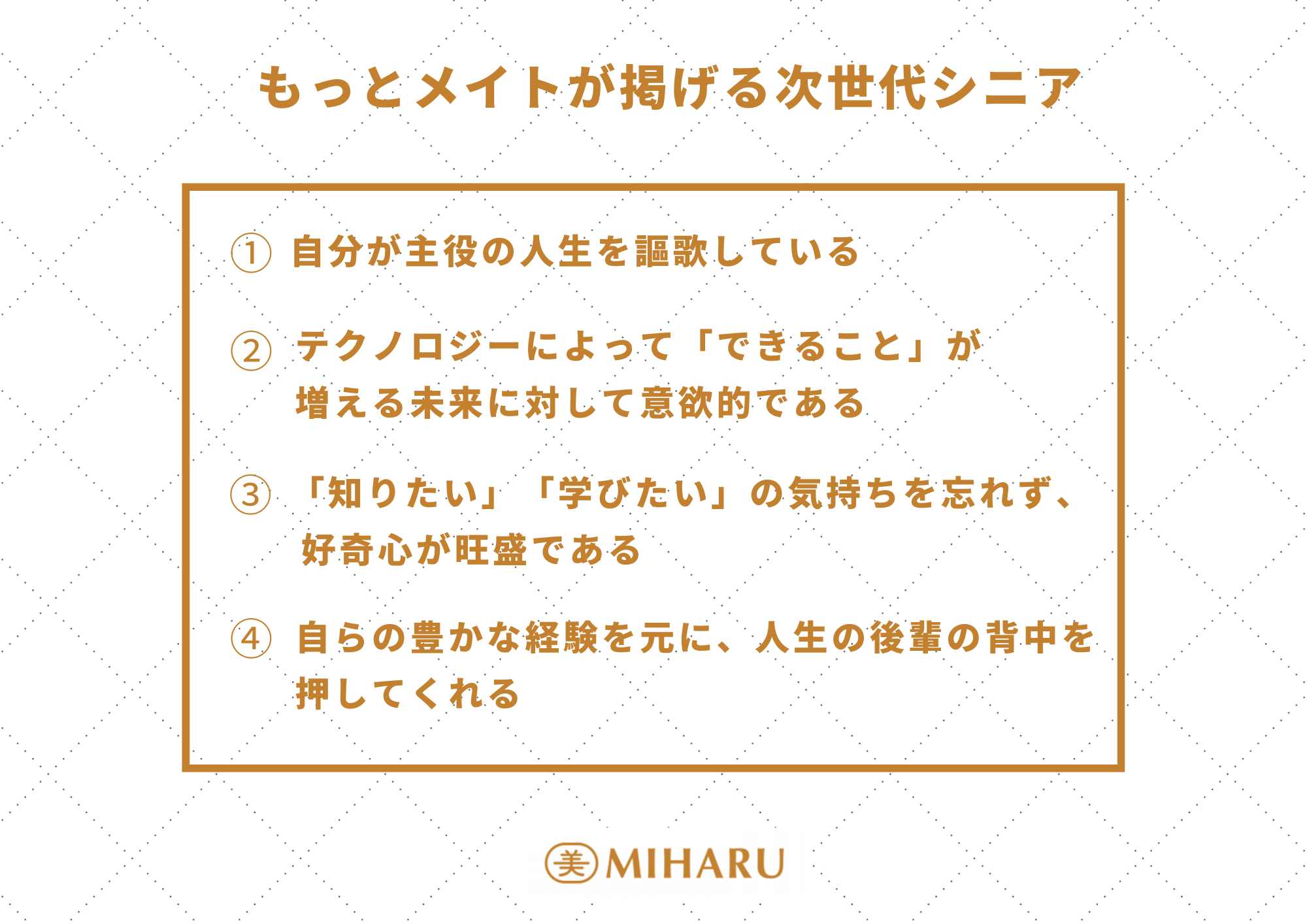 そのためにはまず、「シニア」という言葉の概念を覆す必要があると考え、MIHARUは「次世代シニア」というものを以下の4つに定義しました。