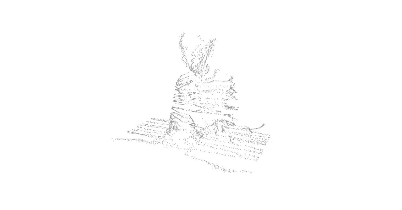 本研究開発では、オフィスでの研修や学校での教育環境において、三次元センサのみを用いて、学習効果を予測する技術に取り組んでいます。LIDAR(Light Detection and Ranging)は、レーザーにより、図1のように、物体の三次元形状を点群データとして取得する三次元センサです。これを用いて、PCで学習を行っている学習者のデータを取得します。取得したデータは、姿勢や手の動きの時系列変化を特徴として含んでいるため、これをエッジAI技術で抽出し、学習効果と対応させることで、予測が可能になります。