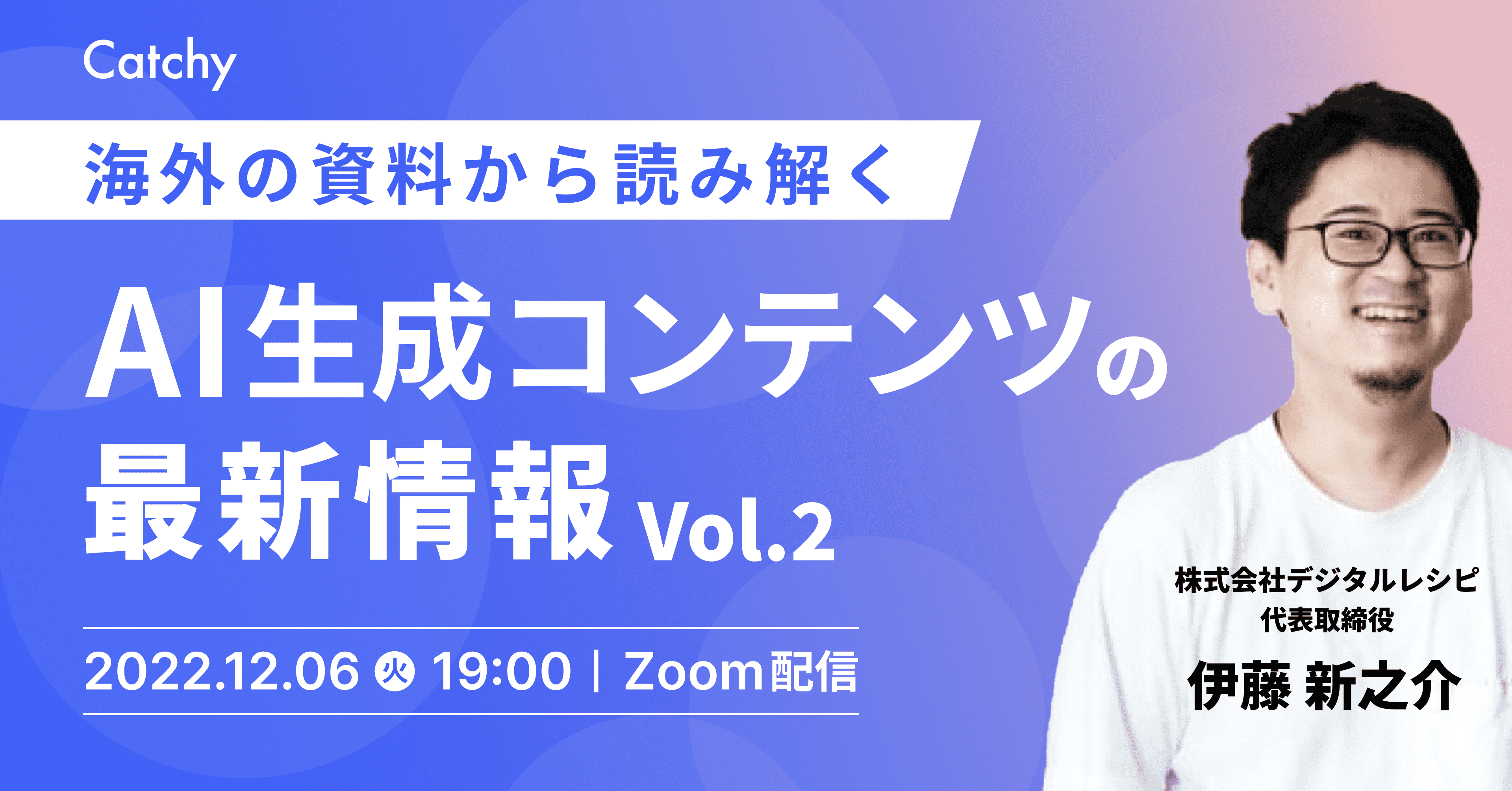 今回のウェビナーでは、国内最大級のAIライティングアシスタントツール「Catchy」の運営会社であるデジタルレシピのCEO伊藤新之介が、目まぐるしく変化するAI生成コンテンツの最新トレンドをご紹介します。
