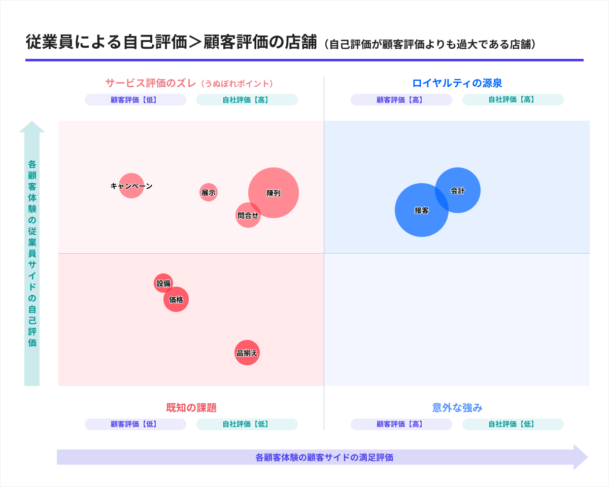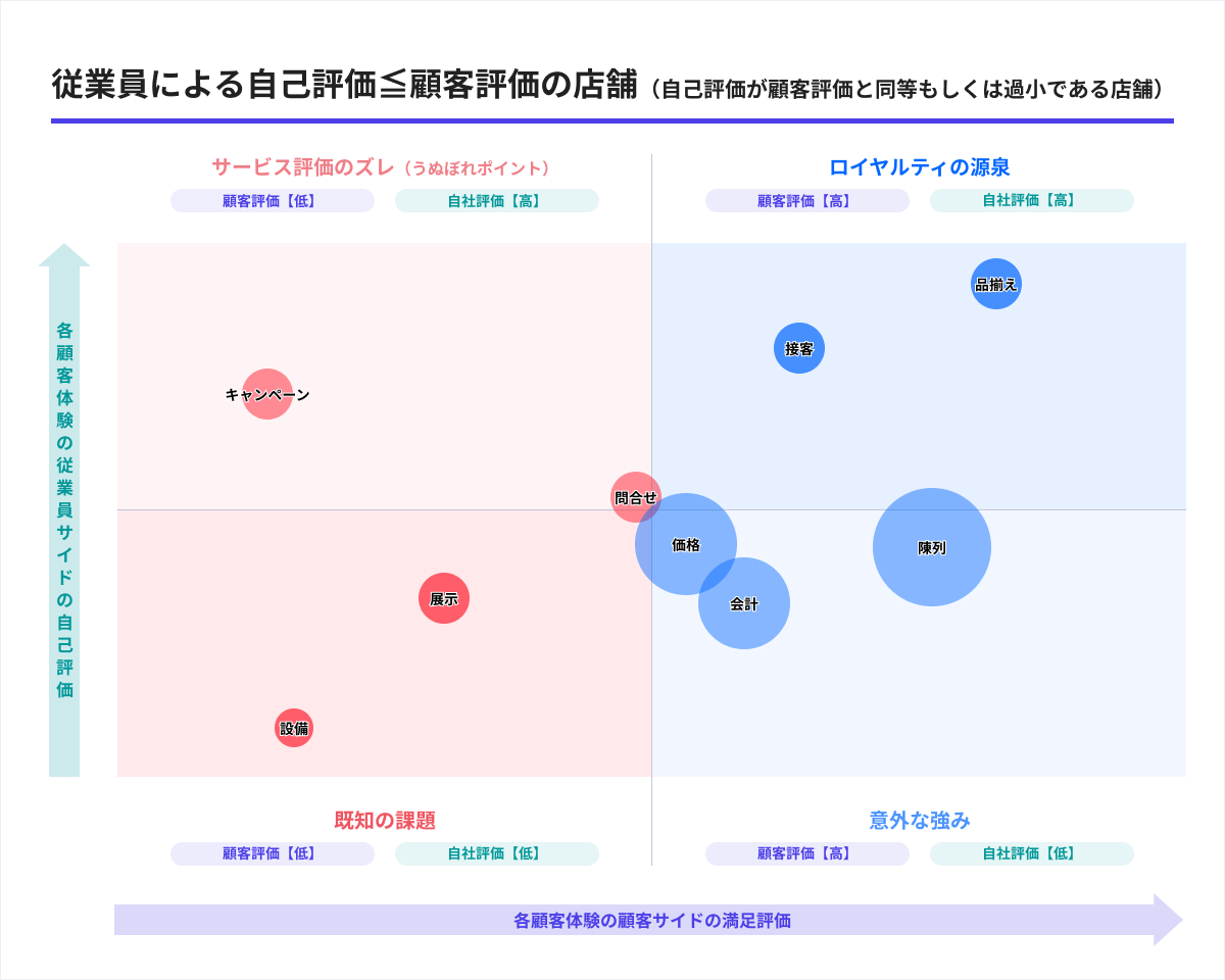 - 従業員による自己評価が顧客評価と同等もしくは過少である店舗では、各顧客体験について、自組織の弱みと強みを正しく認識できているということが言える。