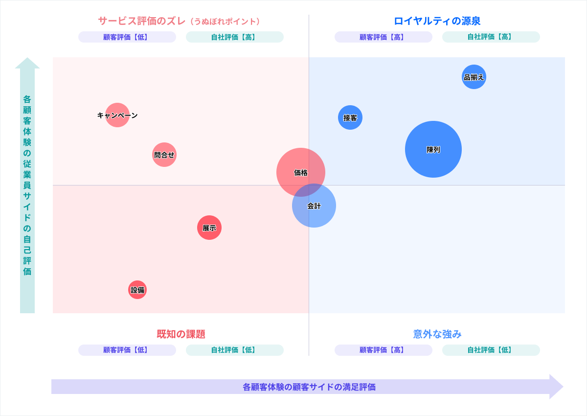 - 逆に、従業員による自己評価が顧客評価よりも過大である店舗では、自組織の弱みであるはずの体験を過大評価する傾向にあった。特に「顧客ロイヤルティに影響が大きい体験」は顧客評価とのズレを埋める必要があるが、これらの店舗は影響の大きい体験も過大評価しやすい傾向が明らかになった。(バブルサイズは顧客ロイヤルティへの影響の大きさを表す(※6))その結果、NPSが低水準となっている可能性が示唆された。
