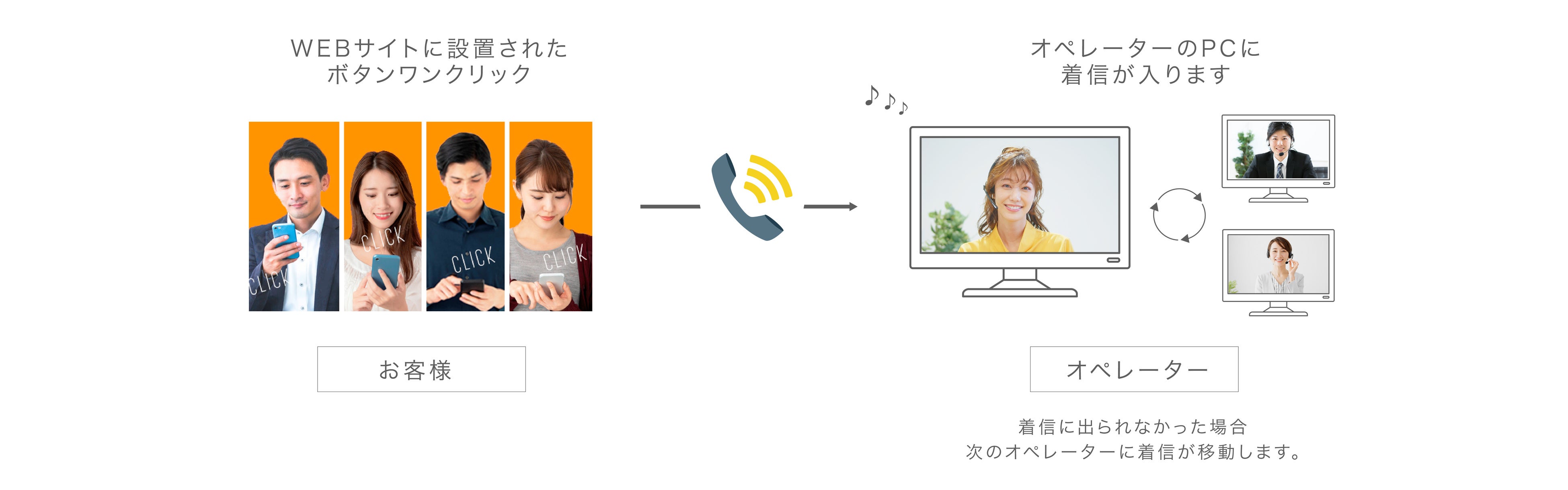 スマホからWEBサイトに設置された「いますぐオンライン相談」のボタンをタップすると、ログイン中のPCから着信音が鳴って知らせてくれる「コール機能」を搭載。作業中でもコール音で着信に気づくことができ、忙しく出られない時は、他オペレーターに着信が移動するという「着信リレー機能」も搭載。