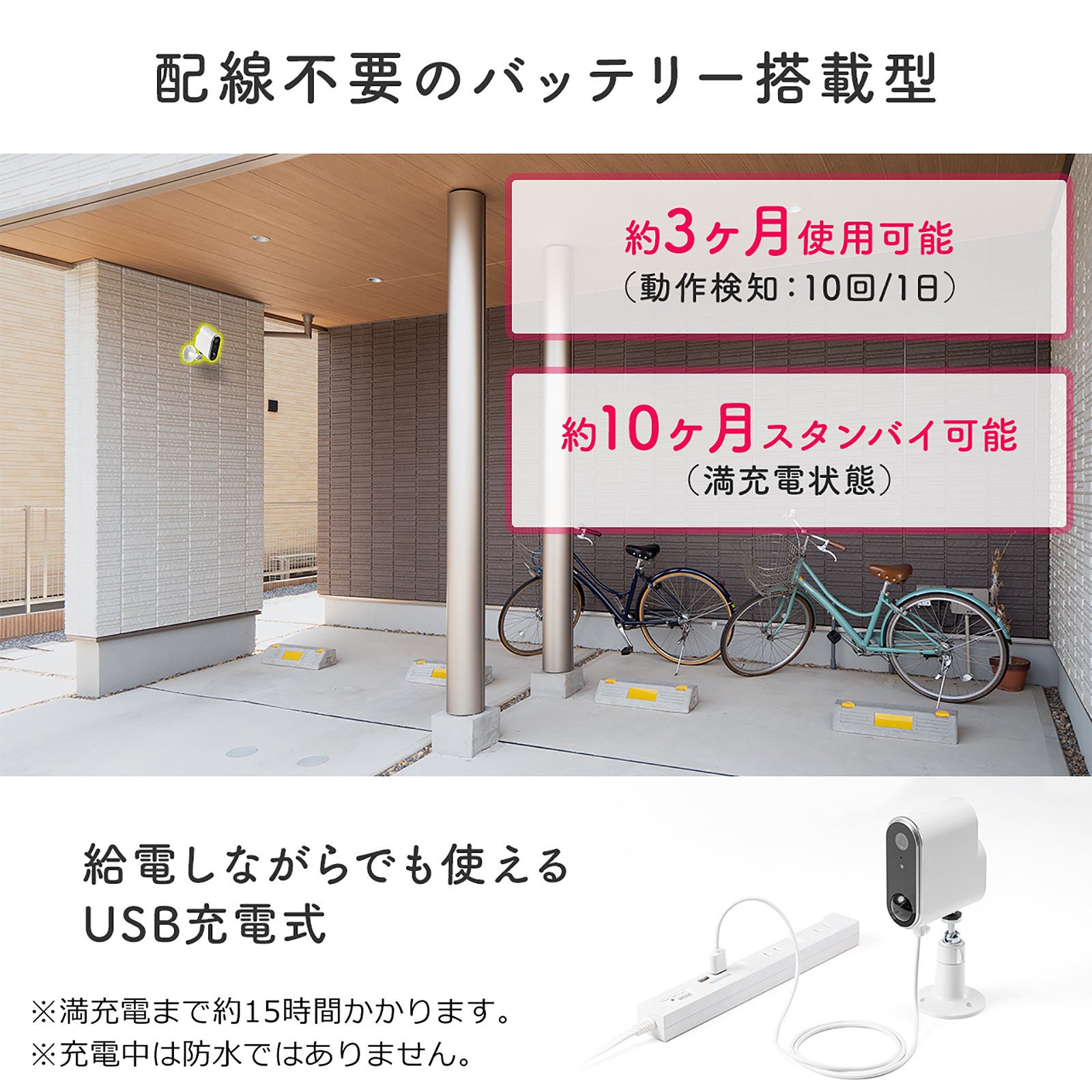 カメラにバッテリーを内蔵しており、一回の満充電で約10ヶ月のスタンバイ状態を保ちます。付属のUSBケーブルでカメラに給電しながらの使用も可能です。