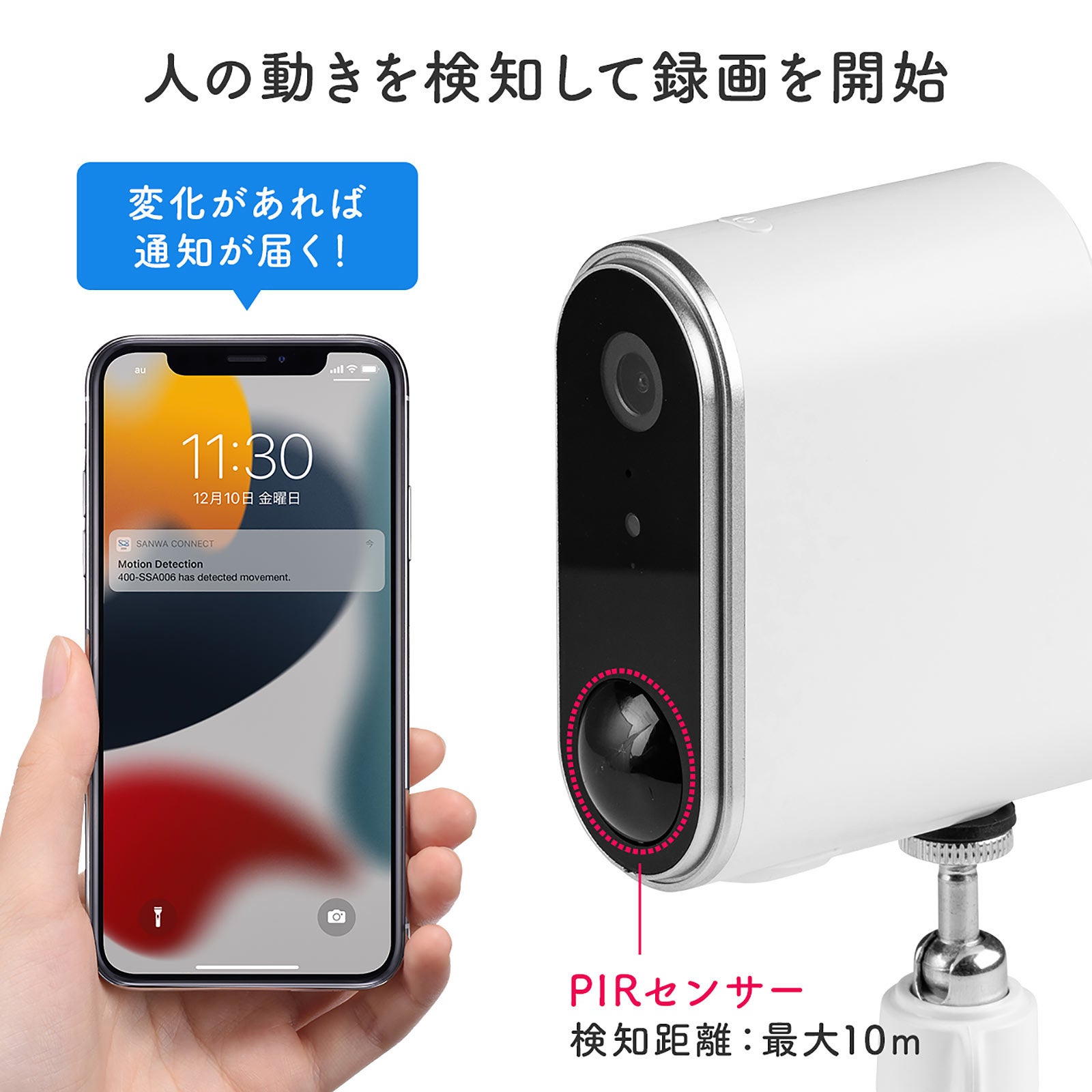 赤外線センサーによる動体検知機能付きのため、動きがあったときだけ撮影され、映像に変化があるとスマホに通知が届き、1日10回の動体検知で約3ヶ月使用できます。