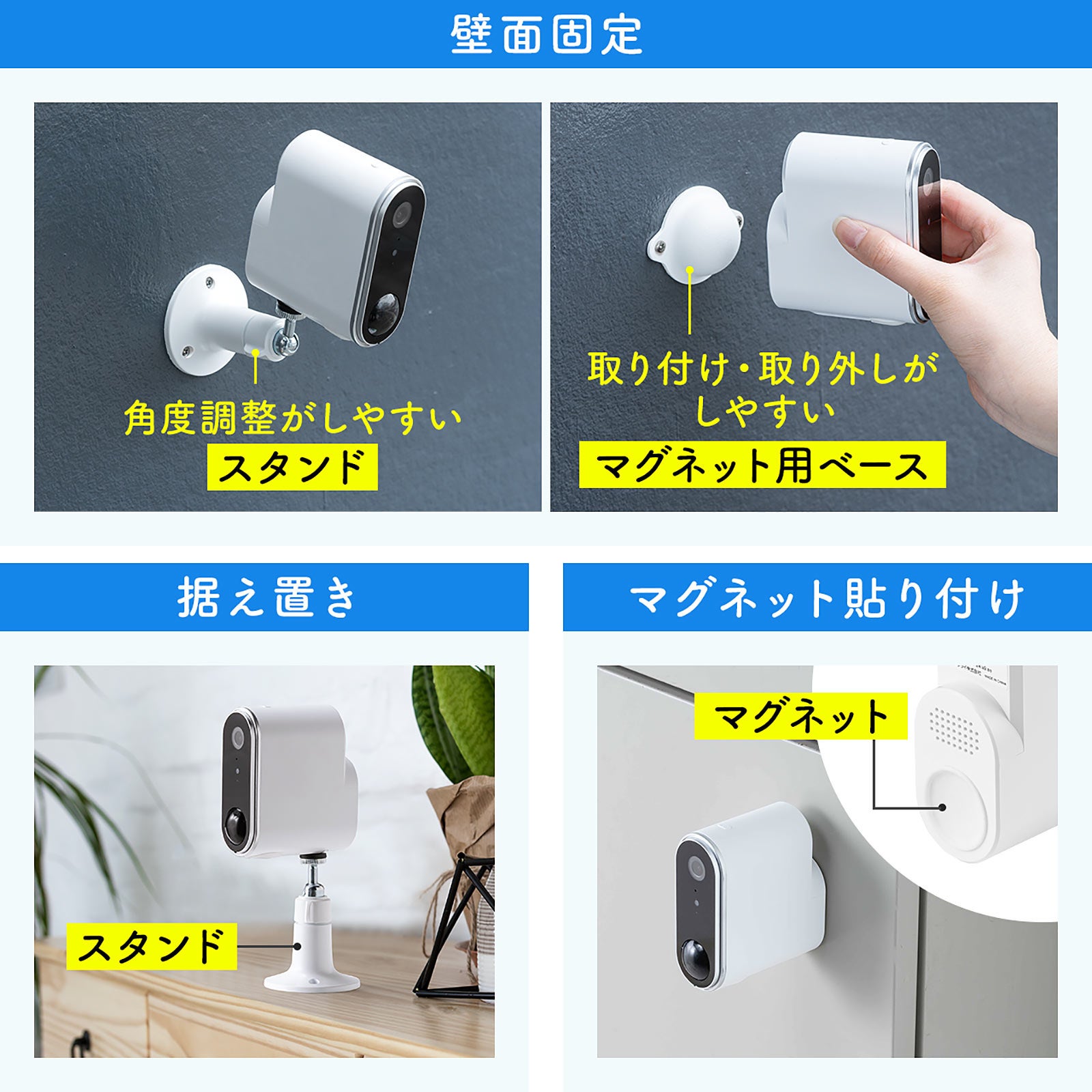 取り付けスタンドは据え置きができ、さらにマグネット固定用ベースとカメラをマグネットで自由に着脱可能です。