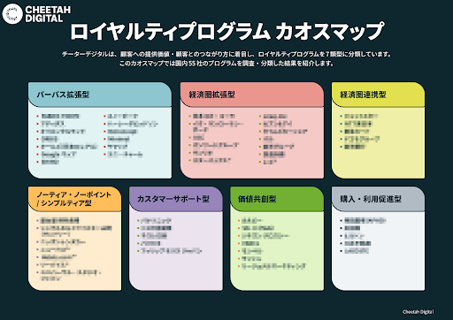チーターデジタルの副社長 兼 CMO の加藤希尊は、次のように述べています。「ロイヤルティプログラムを類型化することによって、自社が提供すべき顧客ベネフィットや顧客体験が明確になります。今回のカオスマップは、新しい顧客体験の創造に取り組む企業にとって、これから顧客に求められるべきプログラムの地図や羅針盤となる役割を担うと考えています」