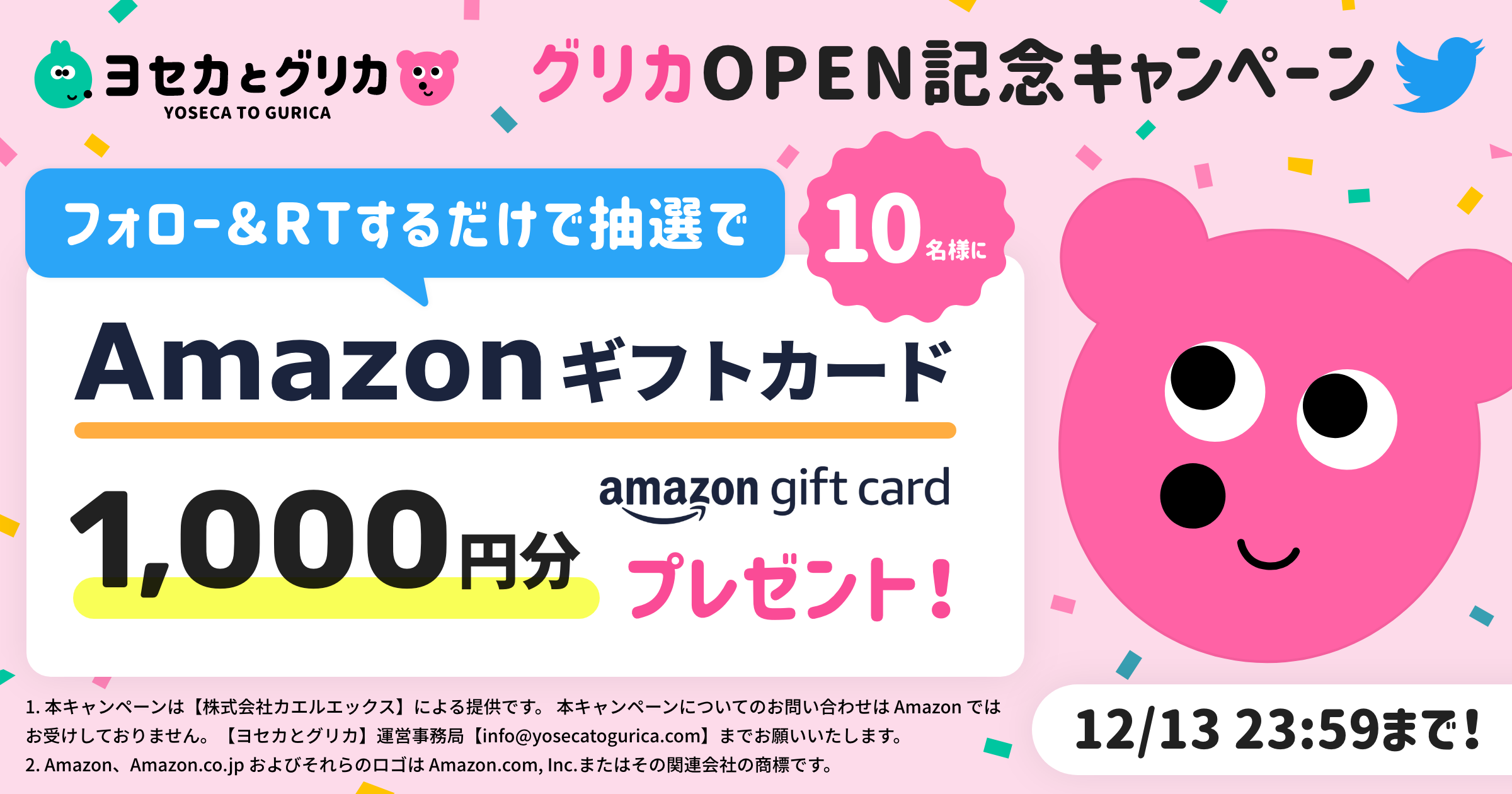■応募内容:グリカプランのオープンを記念して「Amazonギフトカード」1,000円分を抽選で10名様にプレゼント!