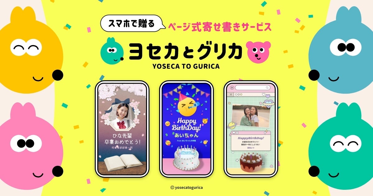 ヨセカとグリカは、音楽と共に楽しくメッセージが飛び出す!アニメーションする新感覚なスマホで贈れるWEBページ式デジタル寄せ書き&グリーティングカード制作サービスです。