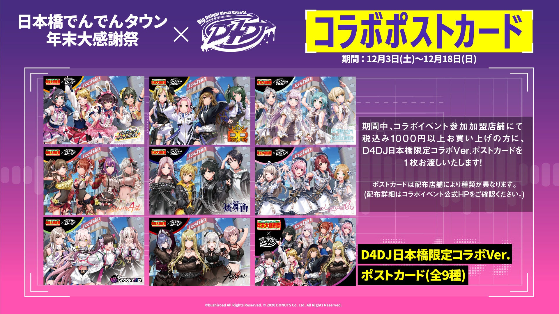 12月3日(土)~12月18日(日)のコラボ期間中、イベント参加加盟店舗にて税込み1000円以上お買い上げの方に、D4DJ限定コラボポストカードを1枚お渡しいたします!