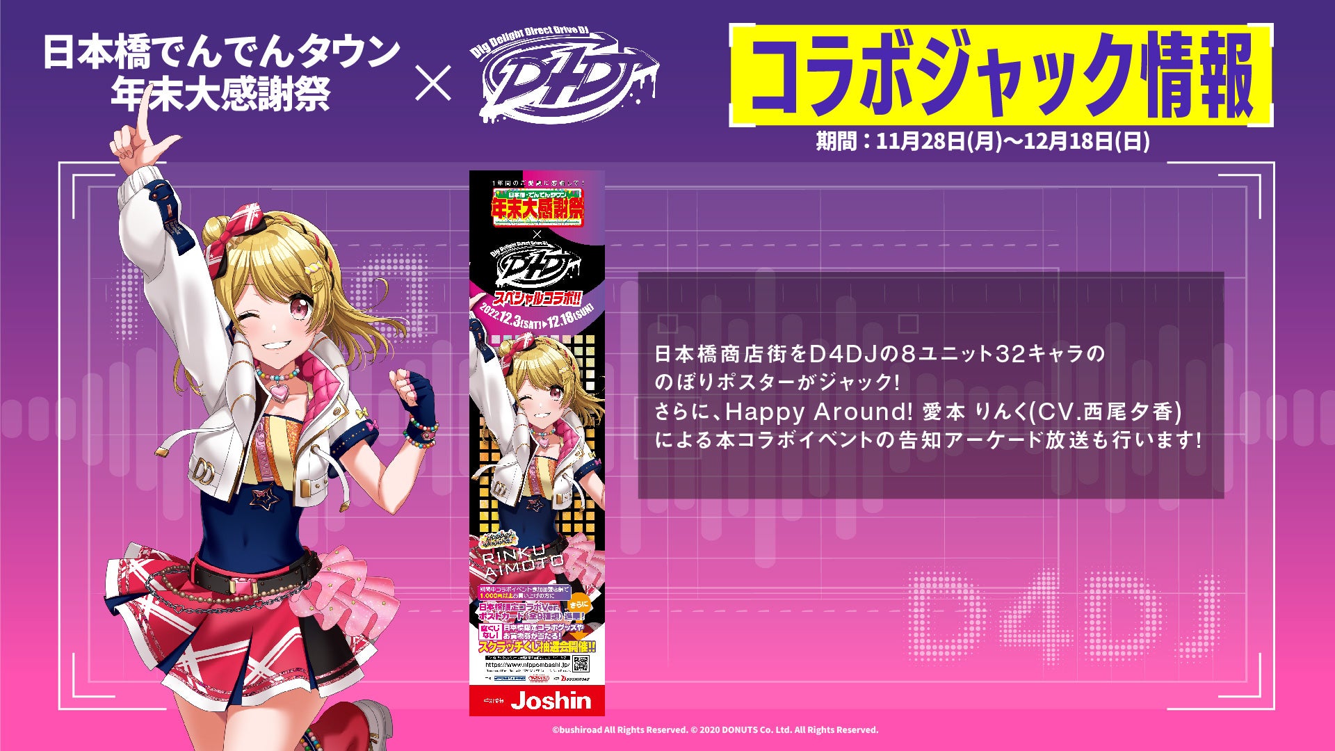 12月3日(土)より、大阪日本橋商店街にて開催の「日本橋・でんでんタウン年末大感謝祭」とスマートフォン向けリズムゲーム「D4DJ Groovy Mix」(グルミク)のスペシャルコラボの実施が決定いたしました。