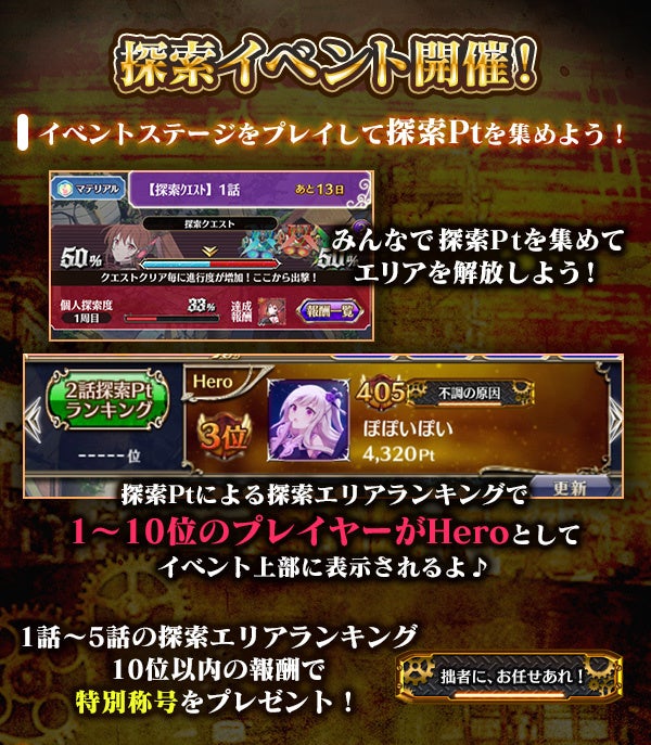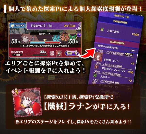 また、エリアごとに個人で集めた探索Ptに応じて、イベント報酬使い魔「【機械】ラナン」や「【二人組】ラナン&アンゼリカ」などが手に入ります。