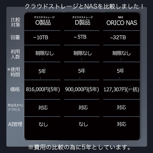 長く使うなら断然NAS!利用人数10名で5年間使用した場合で、それぞれの製品・サービスの比較をしました。