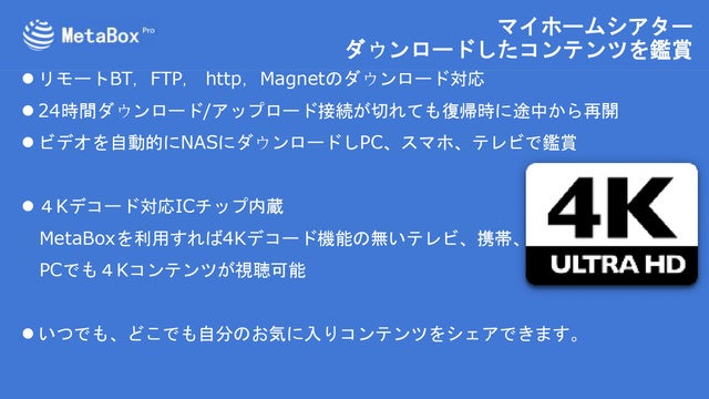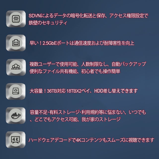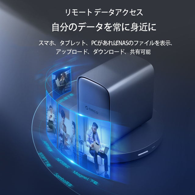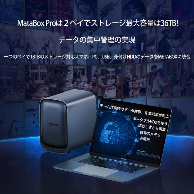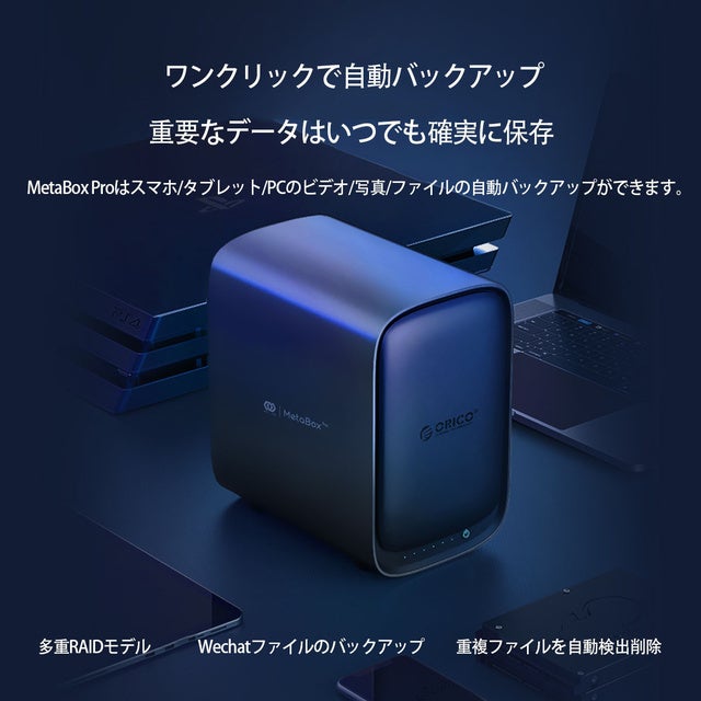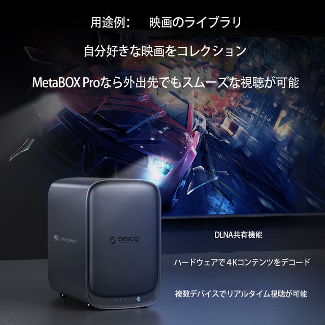ORICO MetaBoxProは既存のクラウドストレージのように上限容量を気にすることなく、どこからでもネットワーク経由で高速で安全に自分のデバイスから保存やアクセスができるハードディスクです。複数のアカウントに対応し、各種アクセス権限の設定、ファイルの変更履歴管理、4Kコンテンツも保存・鑑賞ができます。