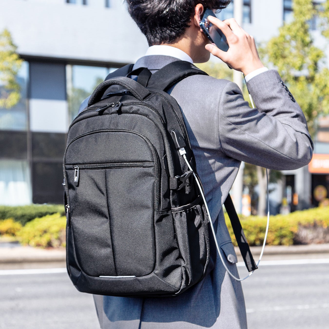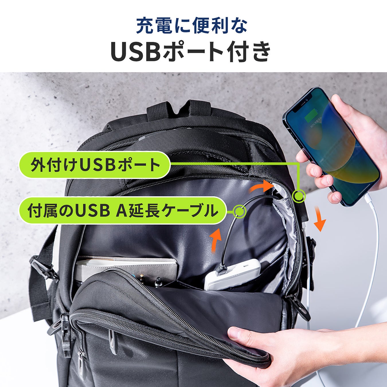 リュック側面にはスマートフォン充電用のUSBポートを搭載。リュック内にモバイルバッテリー(別売)を入れてケーブルを繋ぐと、背負ったままスマートフォンを充電できます。