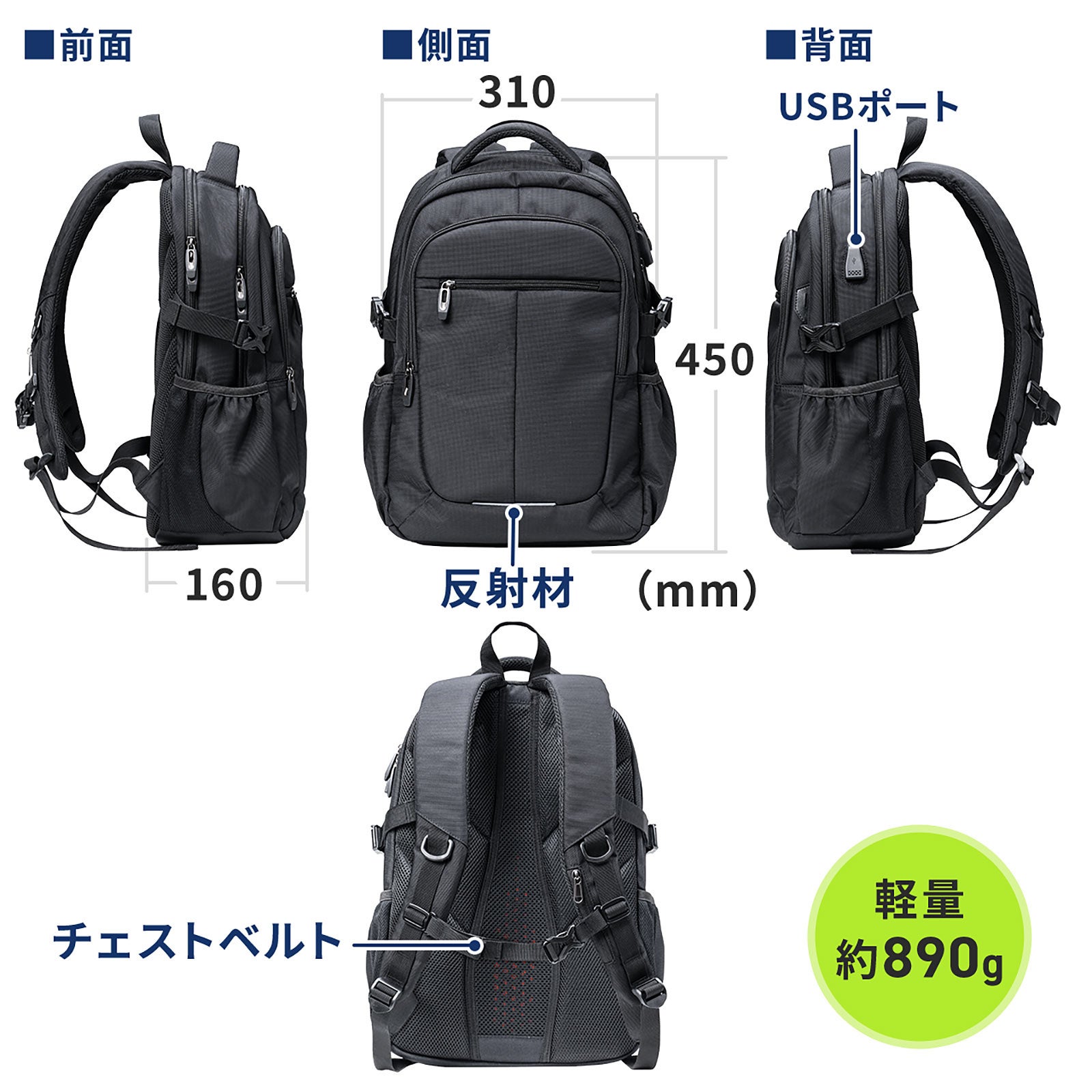 本製品のサイズは約W310×D160×H450mm(取っ手・リュックベルト部除く)、 重量は約890gです。