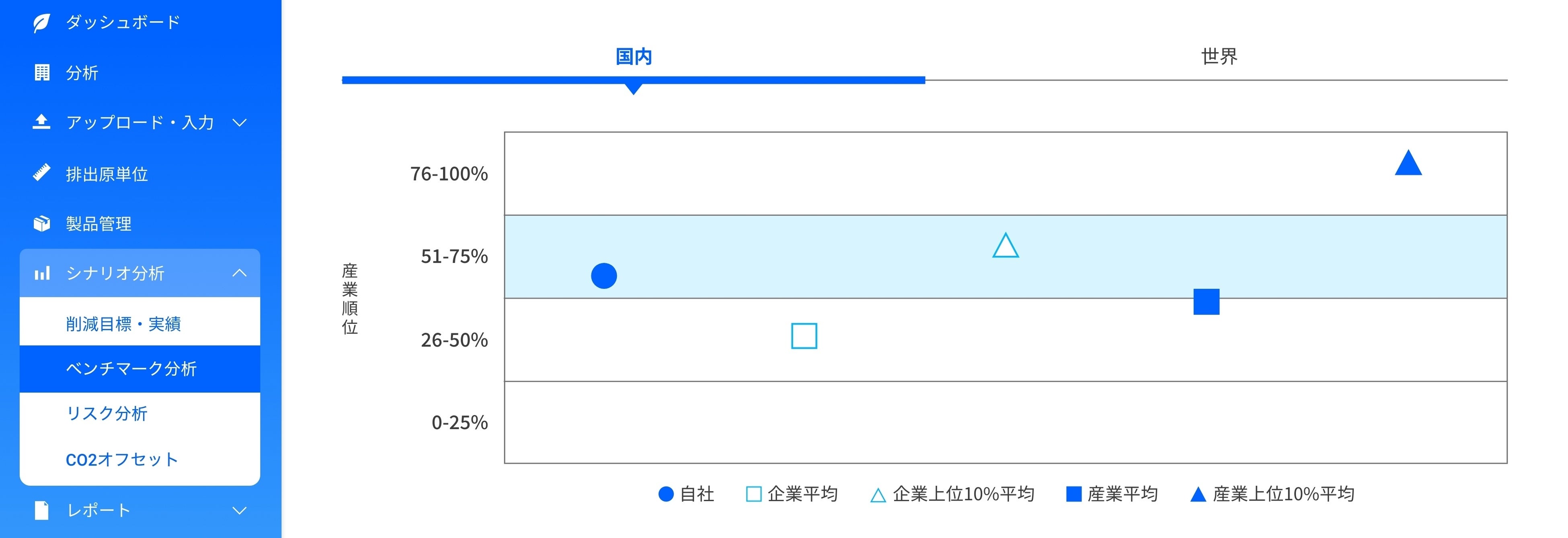 「アスゼロ」を導入する全てのお客さまが、オプションとして機能を利用可能です。国内・海外における同業界のベンチマーク企業やリーダー企業とアスゼロで算出したCO2排出量をもとにした自社のポジショニングを把握できます。