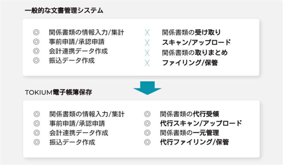 TOKIUM電子帳簿保存では、改正電帳法に準拠して国税関係書類を保存するだけではなく、受領代行によって完全ペーパーレス化と支払い業務全体の効率化を実現します。