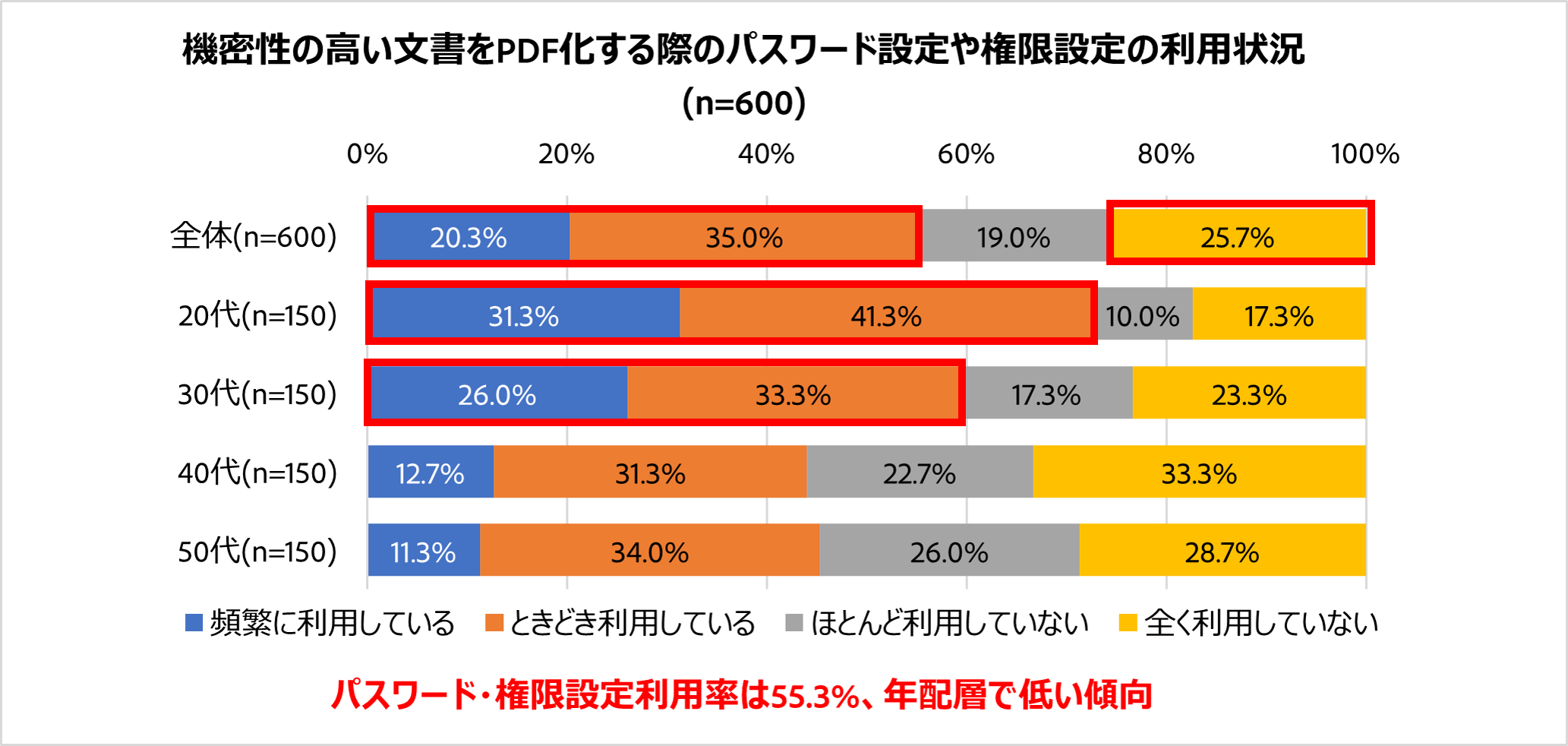 「機密性の高い文書をPDF化する際、パスワード設定や権限設定を行っている」と55.3%が回答、世代が上がるほど利用率が低い傾向