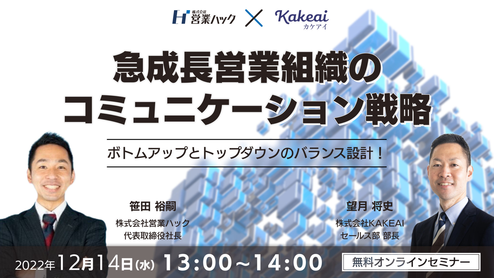 そこで今回のウェビナーでは、本音を引き出す1on1専用ツール 「Kakeai」を提供する株式会社KAKEAIセールス部長望月氏と「営業で悩む人を0にする」というミッションの元、営業代行事業や研修事業を展開する株式会社営業ハック代表笹田が営業組織における1on1やコミュニケーションのポイントをお伝えします。