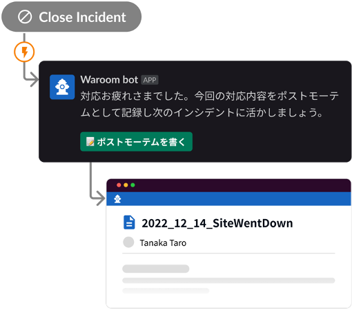 インシデントが収束した場合は、そのインシデントのポストモーテムの作成、保存が可能です。