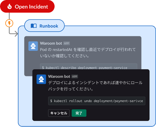 予めインシデントに Runbook を紐付けておくことで、インシデントが作成されると自動的に対応した Runbook を Slack へ表示します。
