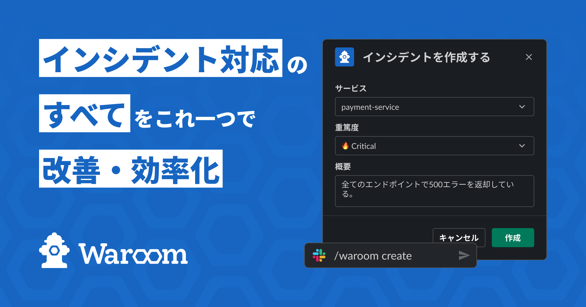 Slack コマンドから簡単にインシデントの宣言ができ、メンバーやチャンネルに共有します。