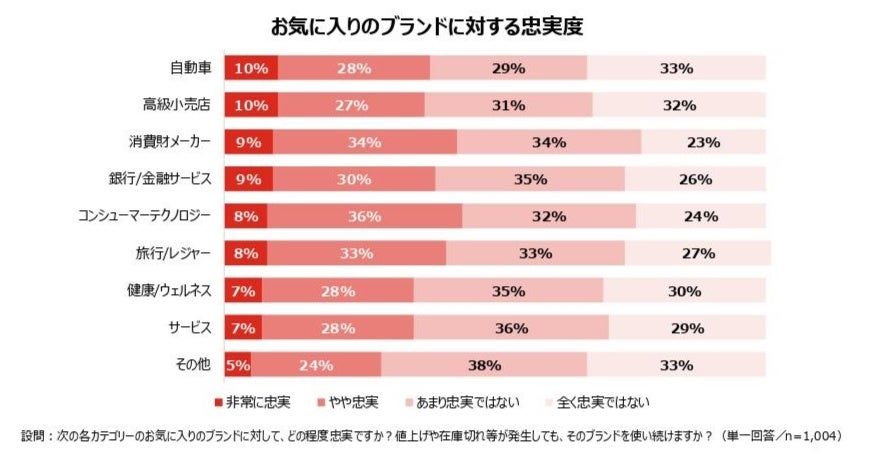 消費者に対して、「お気に入りのブランドに対してどの程度忠実か」と尋ねたところ、「非常に忠実である」と回答した割合は、9つの業界カテゴリー全てにおいて10%以下となった。製品の値上げや在庫切れ等、消費者にとって不都合な事象が発生した際にも、ブランドを好きでいられるのは10人に1人しかいないことが分かった。また、9つのカテゴリー内、コンシューマーテクノロジー(「非常に忠実」と「やや忠実」を合わせた44%)、消費財メーカー(43%)、旅行・レジャー(41%)については、より高いブランドロイヤリティを持つ傾向があることが明らかになった。
