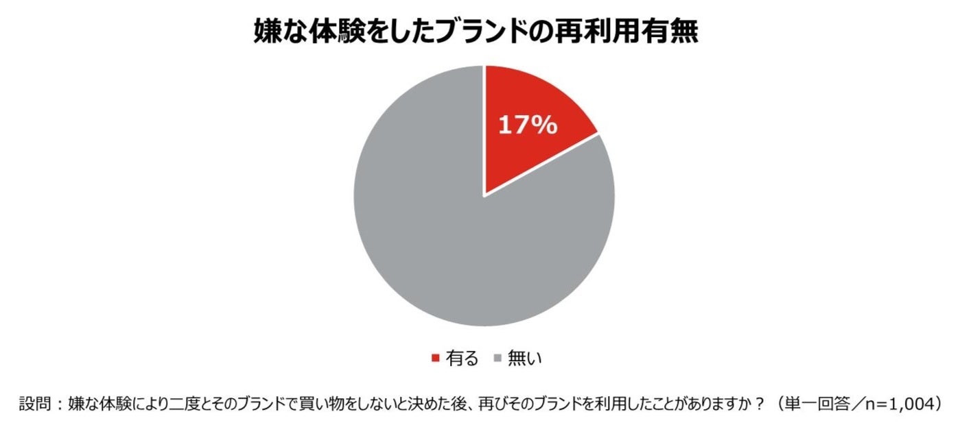 「嫌な体験をして二度とそのブランドで買い物をしないと決めた後、再びそのブランドを利用したことがあるか」と尋ねたところ、そのような経験があるのは、わずか17%だった。たった一度の嫌な体験であっても、その後のブランド利用に関して多大な影響を与えうることが明らかになった。