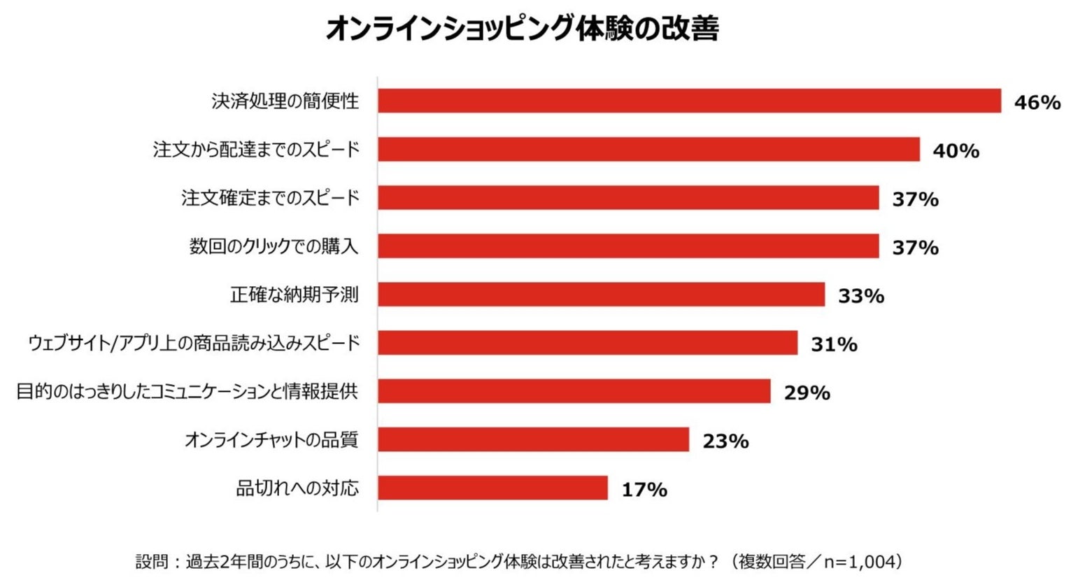 ■コロナ禍の過去2年間に、オンラインショッピングで改善したと感じるのは「決済処理の簡便性」(46%)と「注文から配達までのスピード」(40%)。「品切れ」(17%)や「オンラインチャット」(23%)には改善の余地あり