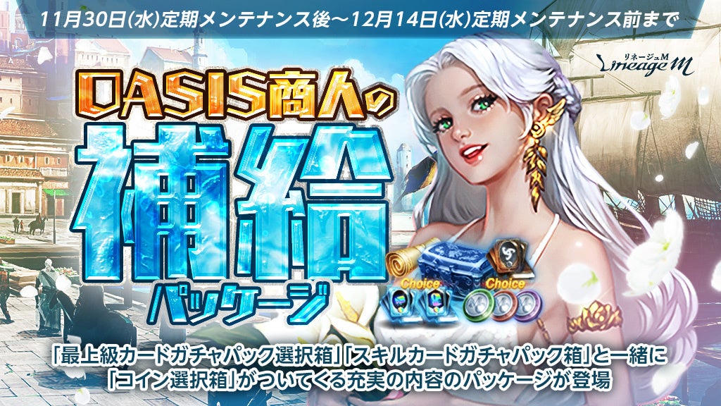 高級~伝説級の変身ガチャパックかマジックドールガチャパックを選択して獲得可能できる「最上級カードガチャパック選択箱」1個、一般~英雄級のスキルカードを獲得できる「スキルカードガチャパック箱(イベント)」2個、各種コイン箱を選択して獲得できる「コイン選択箱」5個がセットになった「OASIS商人の補給パッケージ」が登場しました。
