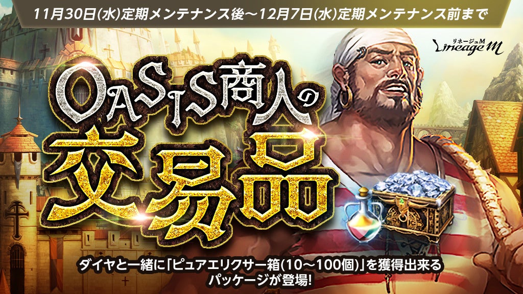 ダイヤと一緒に「ピュアエリクサー箱(10~100個)」1個が獲得できる「OASIS商人の交易品」が登場しました。