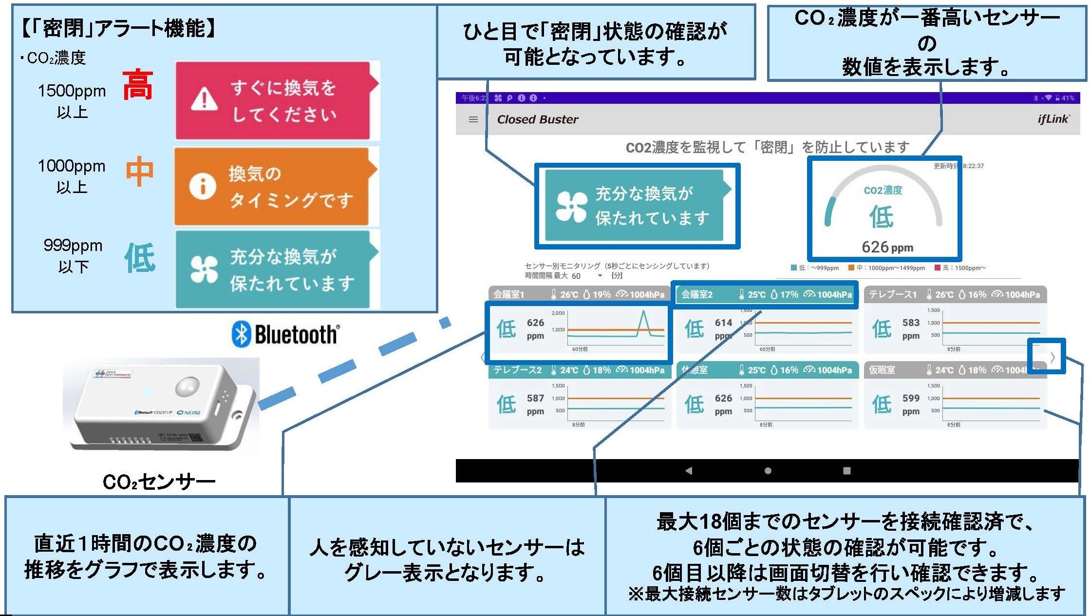 ClosedBuster™は、ifLinkインターフェイスを持ったCO₂濃度センサーとタブレット端末のAndroidソフトがifLink上で動作しています。(標準パッケージ)