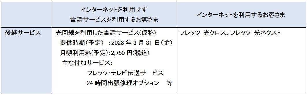 フレッツ 光ライト等をご利用中のお客さまの移行先サービスとして「光回線を利用した電話サービス(仮称)」、「フレッツ 光クロス」および「フレッツ 光ネクスト」をご用意しております。なお、魅力ある移行特典等を検討中ですので詳細が決まり次第別途お知らせいたします。