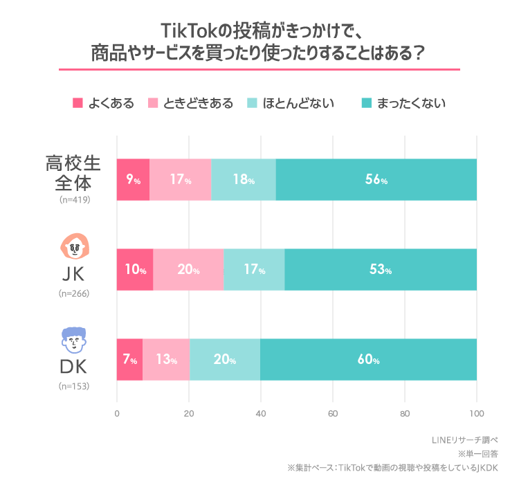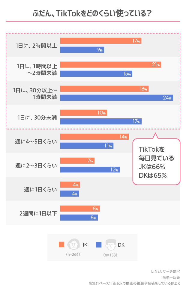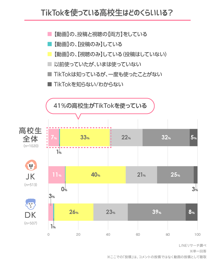 このたびLINEリサーチでは、日本全国の高校生を対象に、TikTokの利用頻度やいちばん好きなTikTokerなどについて調査しましたので、その結果をお知らせいたします。