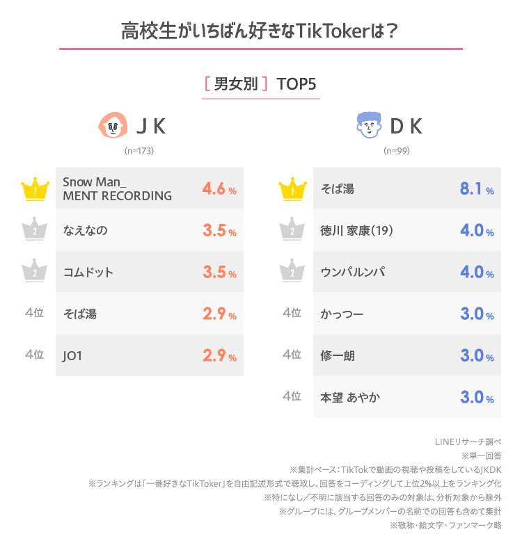 ■高校生がいちばん好きなTikTokerは、女子高生では「Snow Man」が、男子高生では「そば湯」が1位に