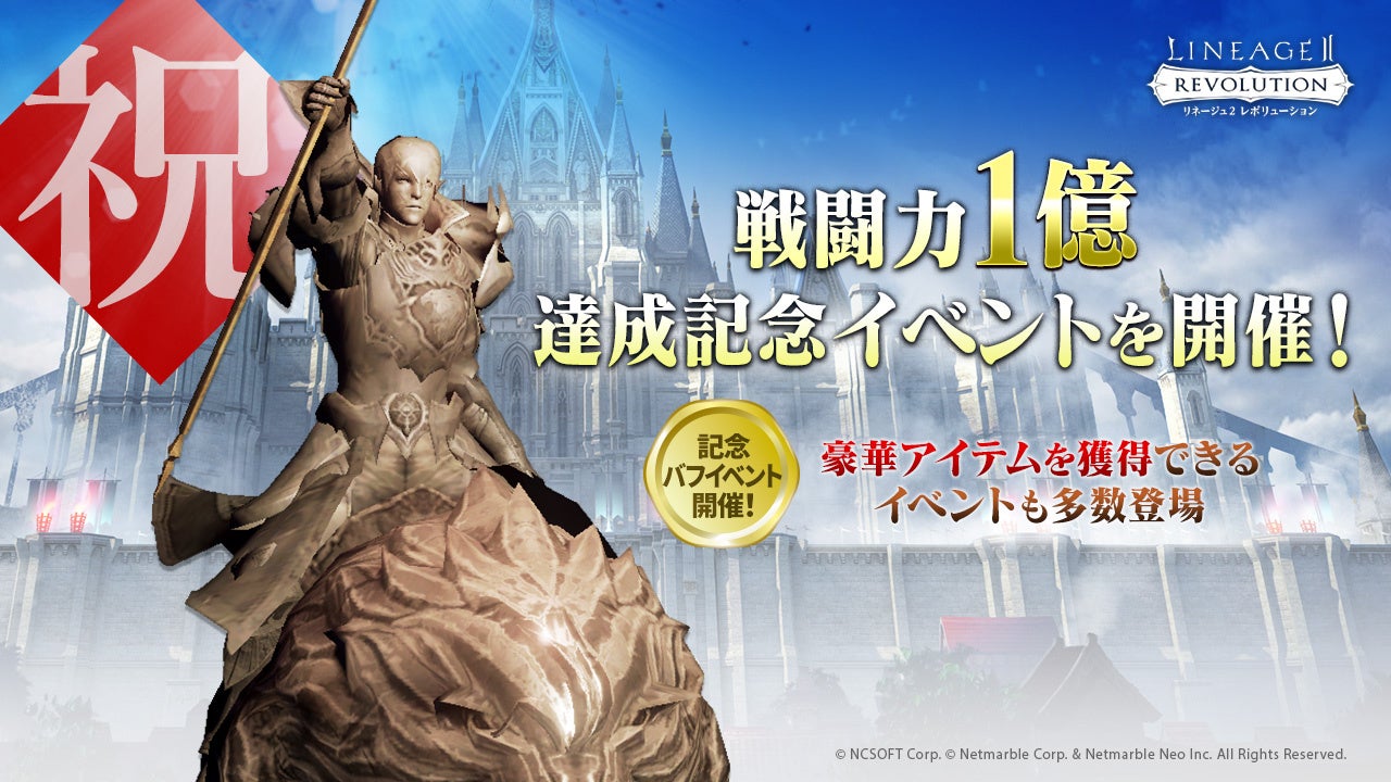 ネットマーブルでは、『リネージュ2 レボリューション』において、11月30日(水)のゲームアップデートより、日本で初の戦闘力1億突破プレイヤーの誕生を記念したイベントを開催いたします。