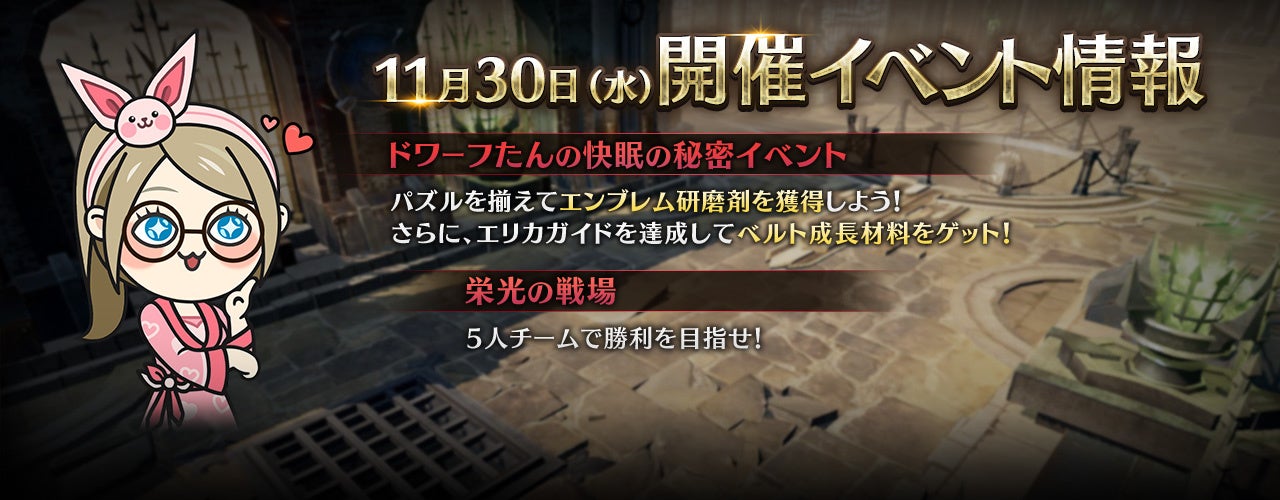 本アップデートより、ミッションクリアで獲得できるパズルピースを集めてパズルを完成させることで、「エンブレム研磨剤」などの豪華報酬を獲得できる「ドワーフたんの快眠の秘密イベント」や、全ミッションの達成で「ベルト超越の石」を獲得できる「エリカガイド:[達成共有]パジャマパーティー!第2弾」などのイベントを開催いたします。