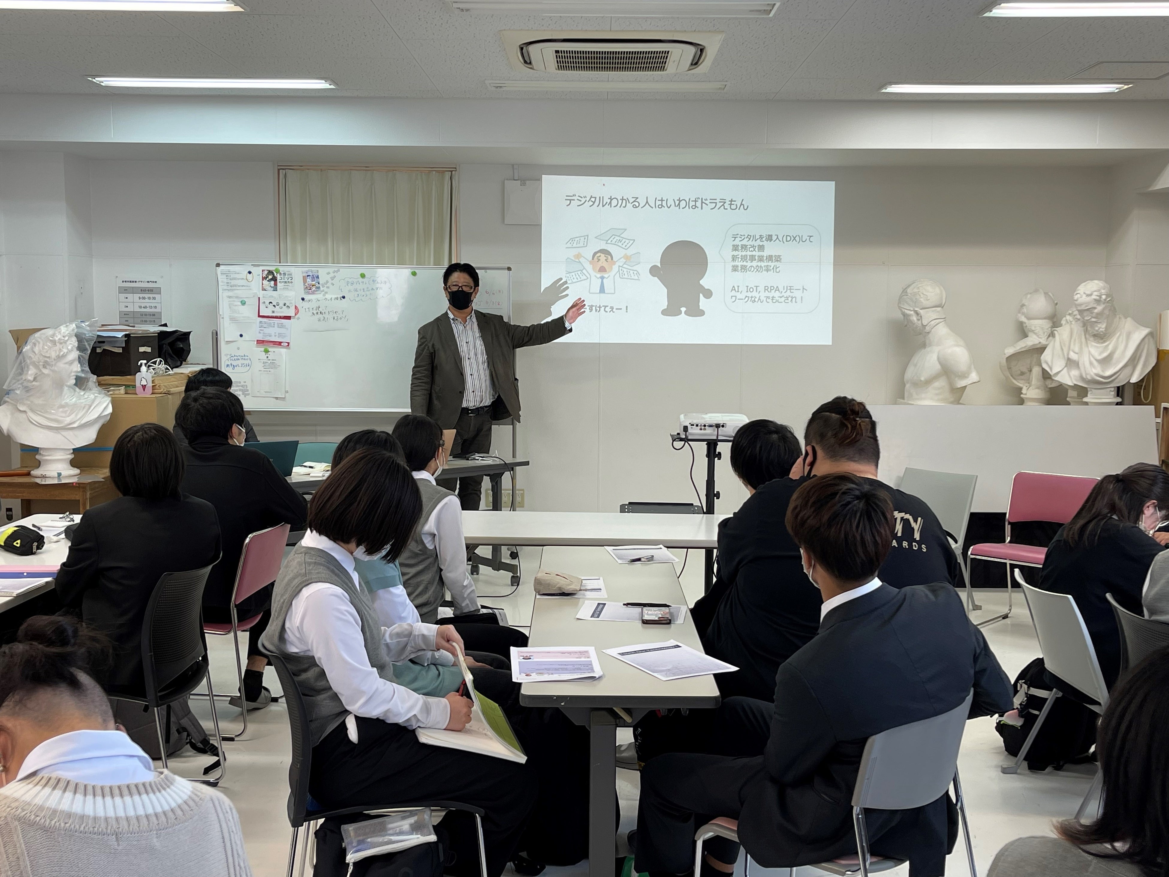 「デジタルが分かる人は、言わば“ドラえもん”です!」と語られ、デジタルスキルを備えることで、あらゆるビジネスシーンで必要とされる人材になれること、またDXが業務改善や効率化、新規事業構築を可能にすることが伝えられました。馴染みのあるキャラクターに例えられたことで、参加者は大いに納得している様子でした。