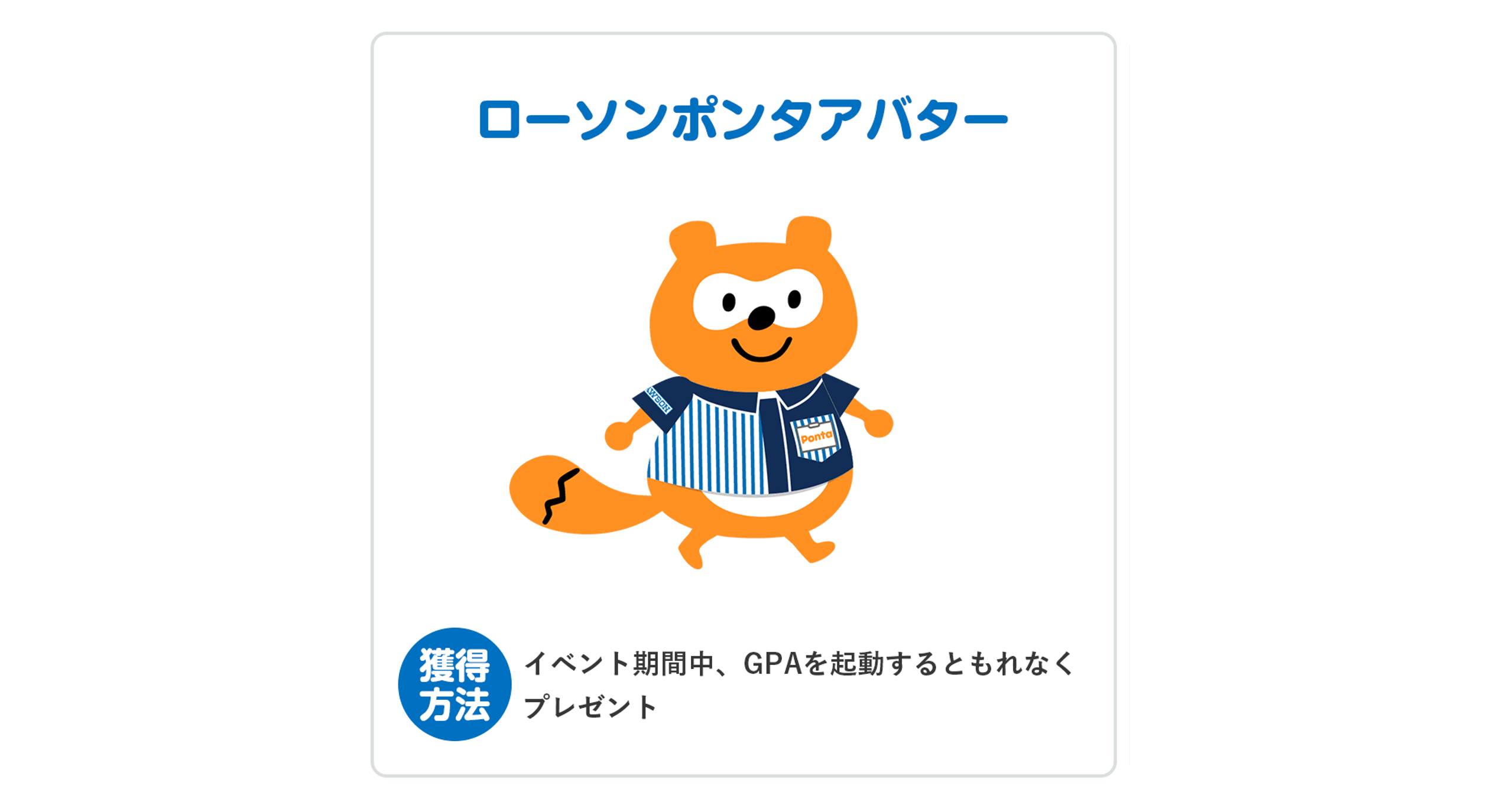期間中、アプリを1度でも起動いただいた方に、「ローソンポンタアバター」をもれなくプレゼントします。ローソンクルーと同じ制服を着たポンタのデザインです。アプリのホーム画面に設定してお楽しみいただけます。