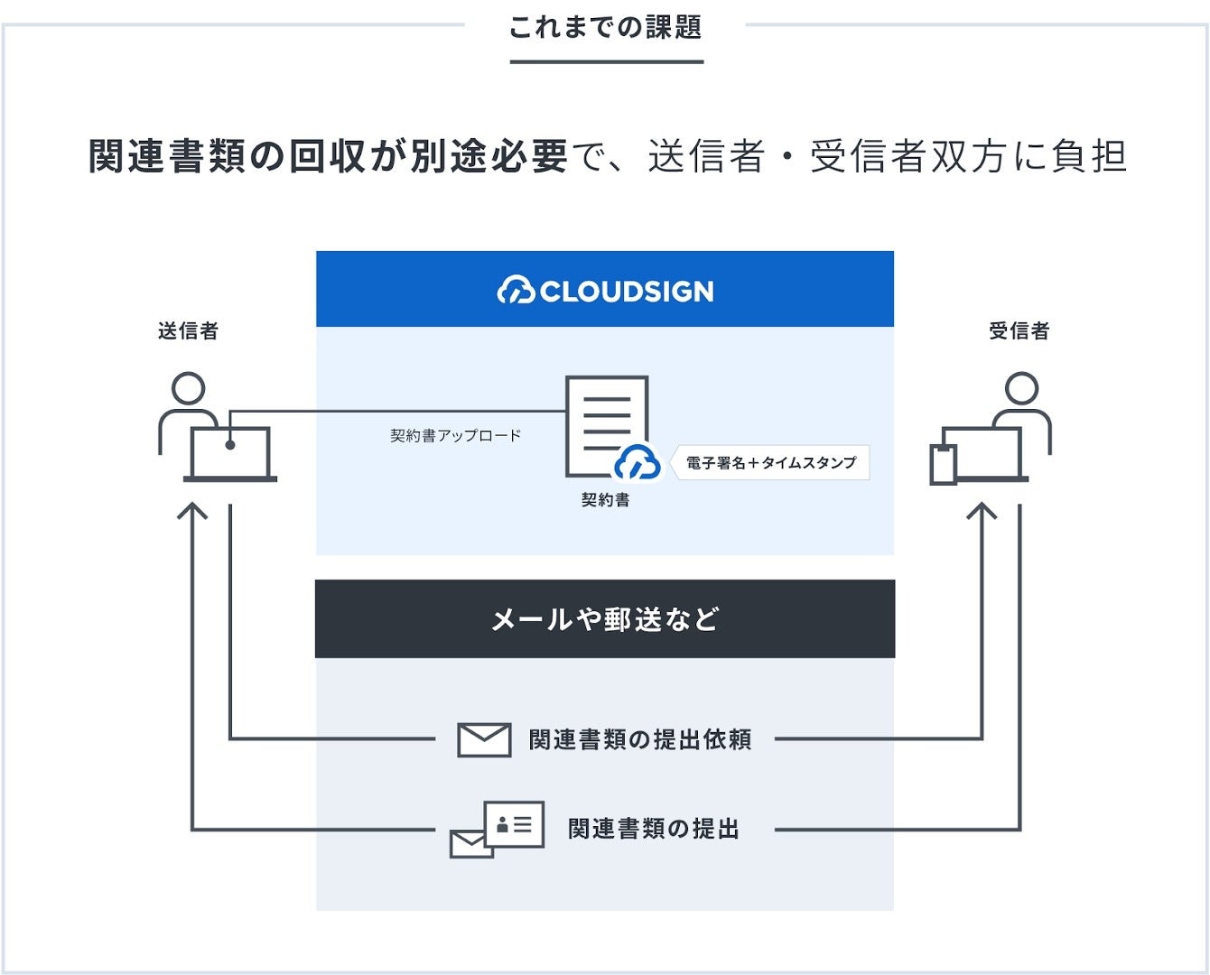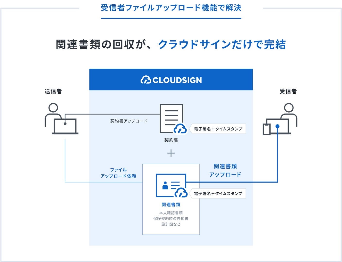 クラウドサインで契約締結をする際、契約書類に関連する資料(本人確認書類など)を受信者がクラウドサイン上にアップロード及びリクエストできる機能です。これまでは送信者が準備・作成した書類のみで契約を締結していたため、本人確認書類の回収などで受信者双方に負担がございました。