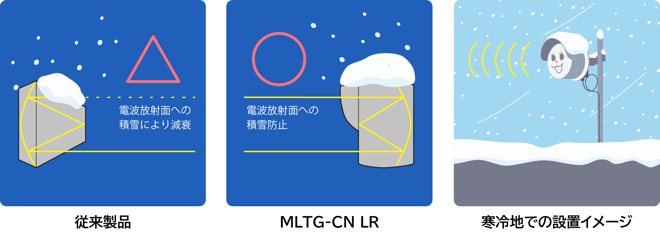 従来製品は、アンテナへの積雪により感度が低下する課題がありました。そこで、「MLTG-CN LR」は電波放射面に雪が積もらない円筒形の形状と、前面にひさしを採用することで、積雪による感度低下を防ぎます。また、本製品はIP66対応の防塵防水仕様に加え、-40℃から60℃まで動作可能であり、寒冷地から砂漠まで様々な環境で利用することができます。