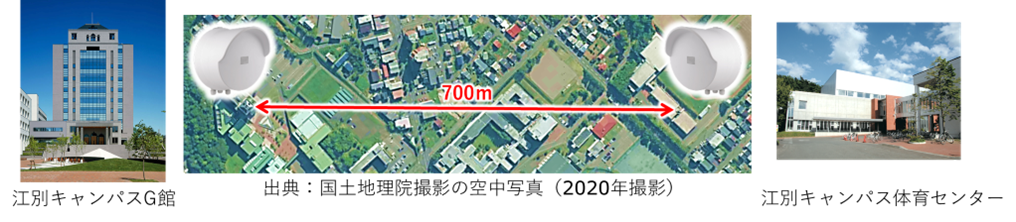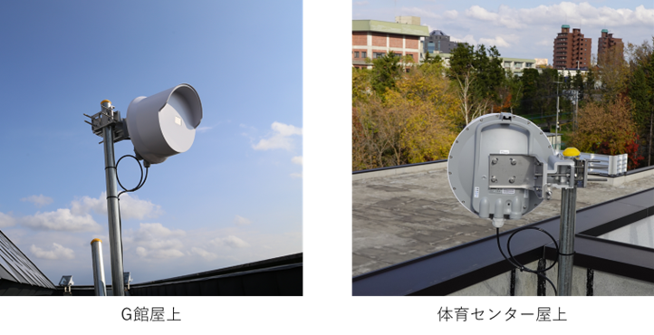 今回の通信試験は2台の「MLTG-CN LR」を同大学構内のG館(8階建て)の屋上と、そこから700m離れた体育センターの屋上(2階建て)に設置し、本年11月から翌4月まで実施いたします。