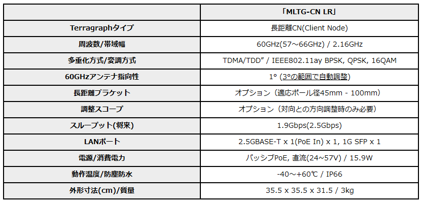 「MLTG-CN LR」は、台湾 Accton Technology Corporation(本社:台湾新竹市、CEO:Edgar Masri)が開発したTerragraphに準拠した高速無線LAN製品で、1kmの距離で1Gbpsを超える通信速度を提供します。本製品には、降雪地域での使用を考慮した積雪対策デザインが採用されています。