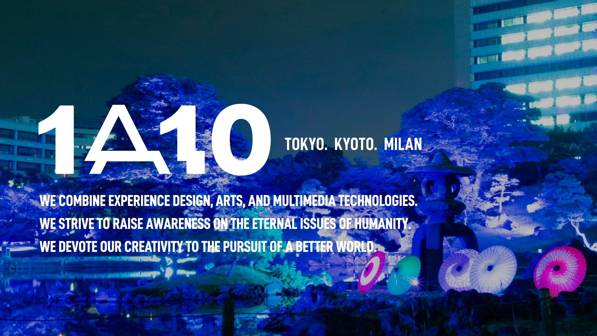「1A10」は、ダイバーシティ・エクイティ&インクルージョンのもと、人々の感性を刺激するマルチメディアアートと革新的なエンターテインメントを世界へ普及させることを目的とした共同ユニットです。世界各地でのマルチメディアインスタレーションやショー演出、没入型体験コンテンツなどの知見を有したメンバーが共創し、XRやAIなどに代表される先端テクノロジーとクリエイティビティを掛け合わせた、全人類的な課題への気づきを促す体験をグローバルに展開してまいります。