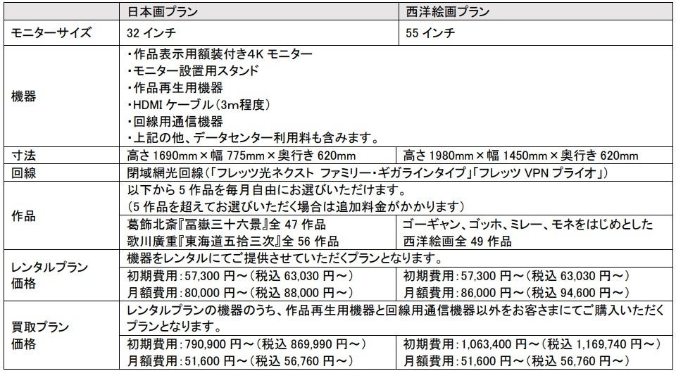 また、これまでご提供していた日本画プランの価格を見直しました。プランはレンタルと買取から選択いただくことができ、作品を表示する機器、配信するための通信回線、設置工事まで一括でご提供いたします。