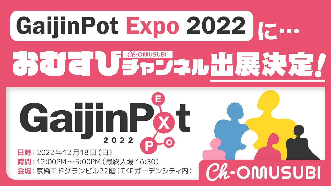 訪日・在日外国人に対して、求人情報から日本語学習、トラベルまで、幅広いコンテンツを提供する総合情報サイト「Gaijin Pot」が主催する大規模展示会Gaijin Pot Expo2022に初出展します。当日はセミナーセッション及び企業ブースにて、おむすびチャンネル運営及び配信者委員会メンバーが、来場者に対しておむすびチャンネルの説明を行い、新規シナジーを図ります。