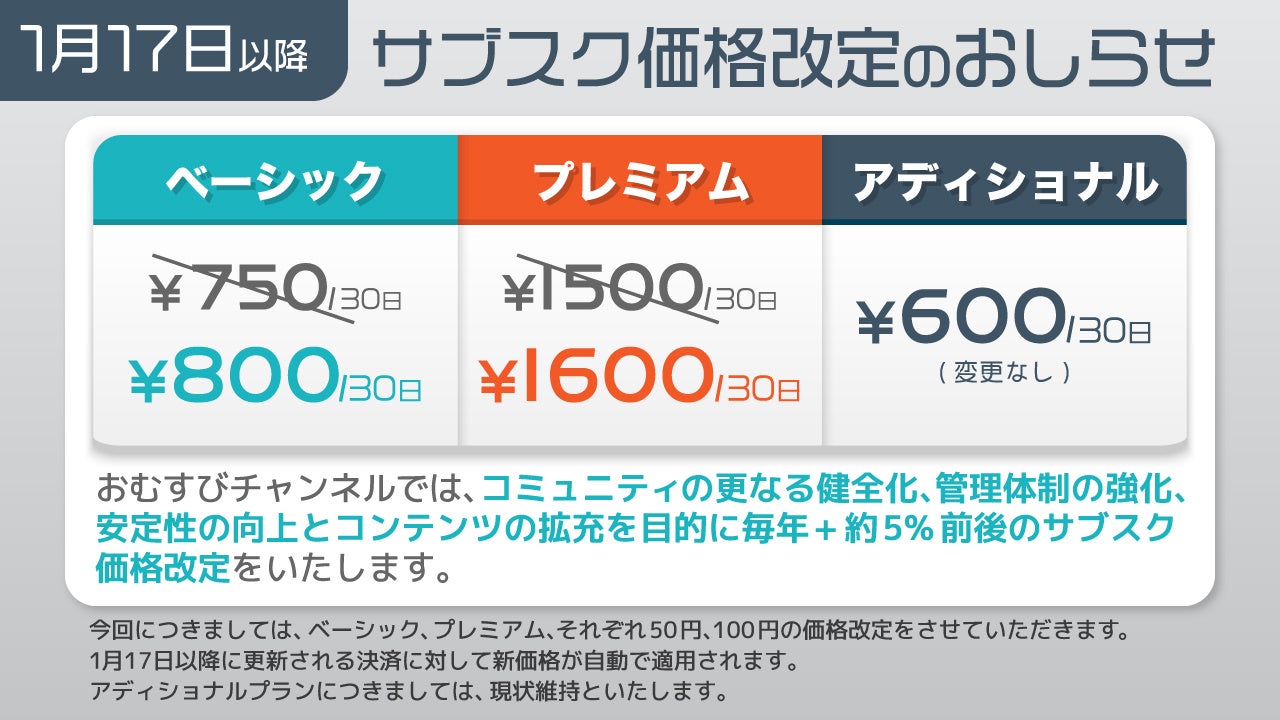 おむすびチャンネルでは、コミュニティの更なる健全化、管理体制の強化、安定性の向上とコンテンツの拡充を目的に毎年+約5%前後のサブスク価格改定をいたします。また、会員数の拡大に伴うサーバー代の増加、長らく続いたドル高・円安によるドル建て経費の上昇、新機能の拡充等運営コストの増加も鑑み、2023年1月17日(予定)より、ベーシックプランを+50円、プレミアムプランを+100円、それぞれ価格改定させて頂きます。