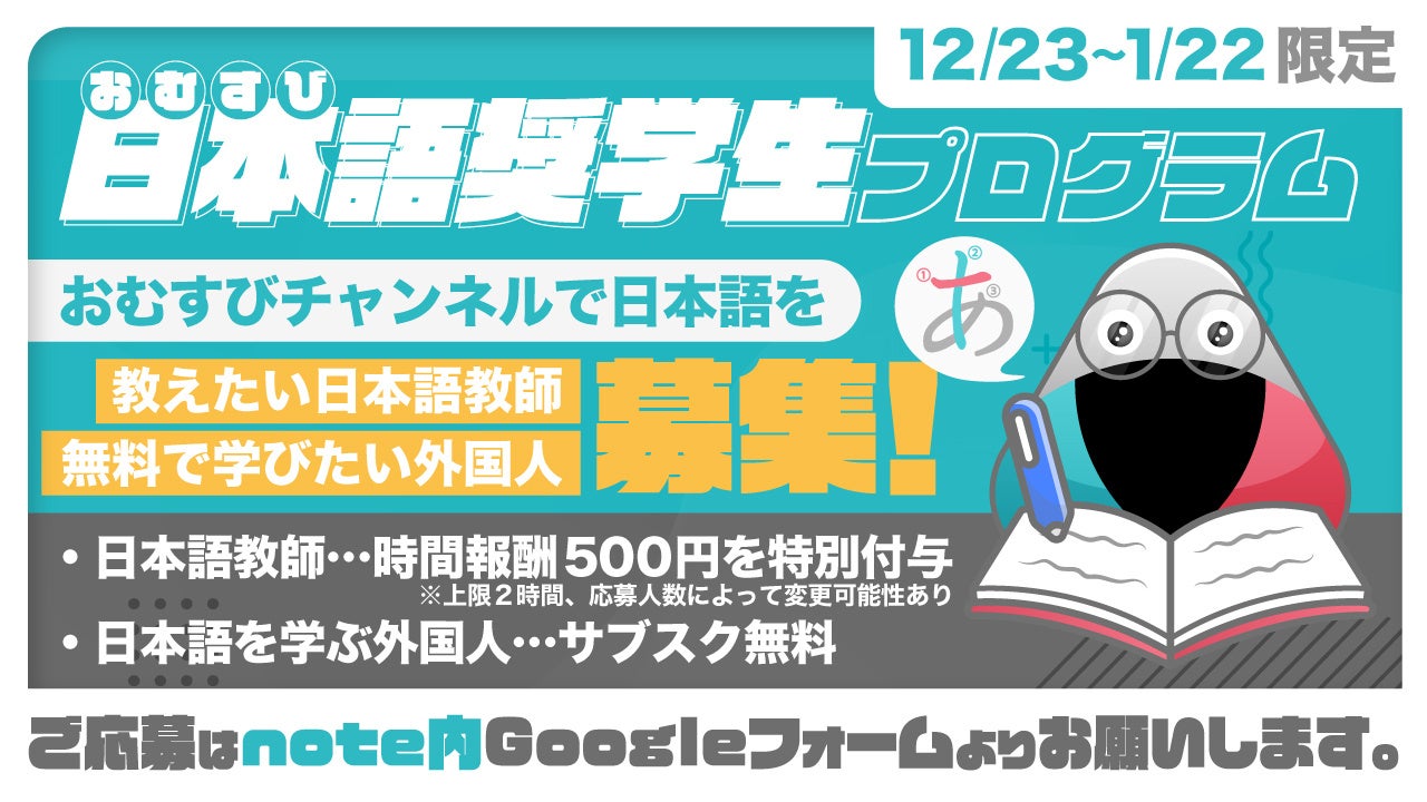 12月23日~1月22日の期間中「おむすび日本語奨学生」プログラムと題し、日本語を学ぶ外国人に無料でおむすびチャンネルを視聴できる権限(ベーシックプランのみ)を付与します。これにより、授業のない冬期休暇中でも場所を問わずオンラインで継続して日本語学習を継続する機会を提供します。